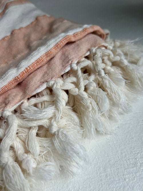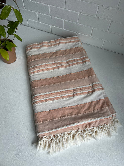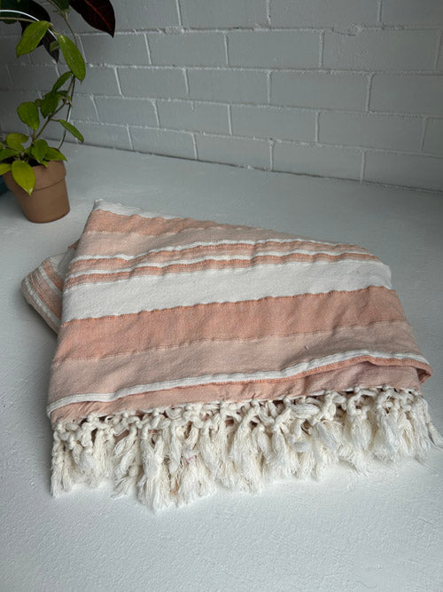 Light and airy cotton throw or bed top blanket with a cute fringe detail. Blanket is in very good condition and is looking for a new home to spread the love!