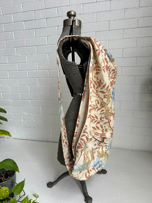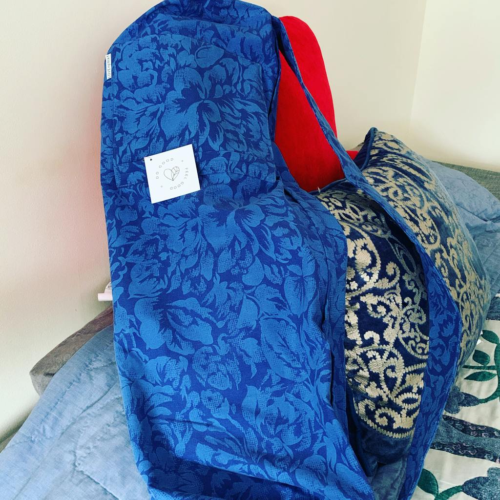 This yoga mat bag was the first product we ever made from upcycled textiles. These mat bags are larger than they appear to hold your mat and lots of other accessories.